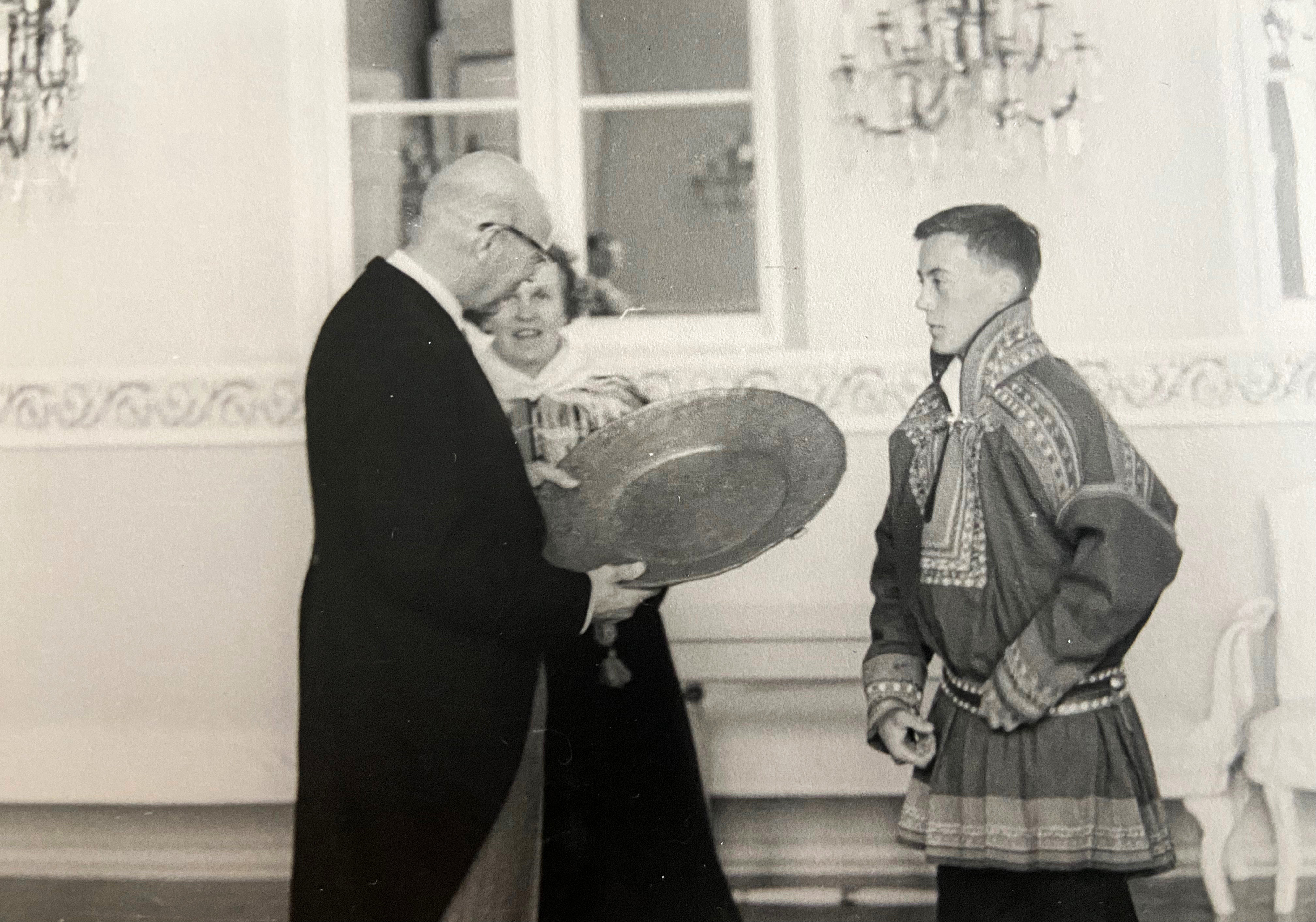 Kuva 15. Audienssi presidentti Urho Kekkosen luona presidentinlinnassa luokkaretken aikana. Sunkku esitteli oppilaat presidentille. Minä ojensin presidentille lahjaksi vaskoolin. Kuva Erkki Heinosen arkisto.