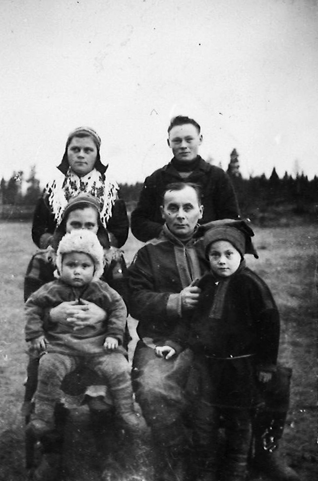 Kuva 4. Takana Aune ja Jouni, äiti sylissään Esko ja minä isän edessä arviolta vuonna 1947. Kuva Sten Suvio.